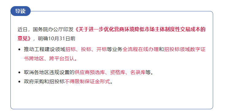 (四)切实规范政府采购和招投标。持续规范招投标主体行为,加强招投标全链条监管。2022年10月底前,推动工程建设领域招标、投标、开标等业务全流程在线办理和招投标领域数字证书跨地区、跨平台互认。支持地方探索电子营业执照在招投标平台登录、签名、在线签订合同等业务中的应用。取消各地区违规设置的供应商预选库、资格库、名录库等,不得将在本地注册企业或建设生产线、采购本地供应商产品、进入本地扶持名录等与中标结果挂钩,着力破除所有制歧视、地方保护等不合理限制。政府采购和招投标不得限制保证金形式,不得指定出具保函的金融机构或担保机构。督促相关招标人、招标代理机构、公共资源交易中心等及时清退应退未退的沉淀保证金。(国家发展改革委、财政部、市场监管总局等国务院相关部门及各地区按职责分工负责)